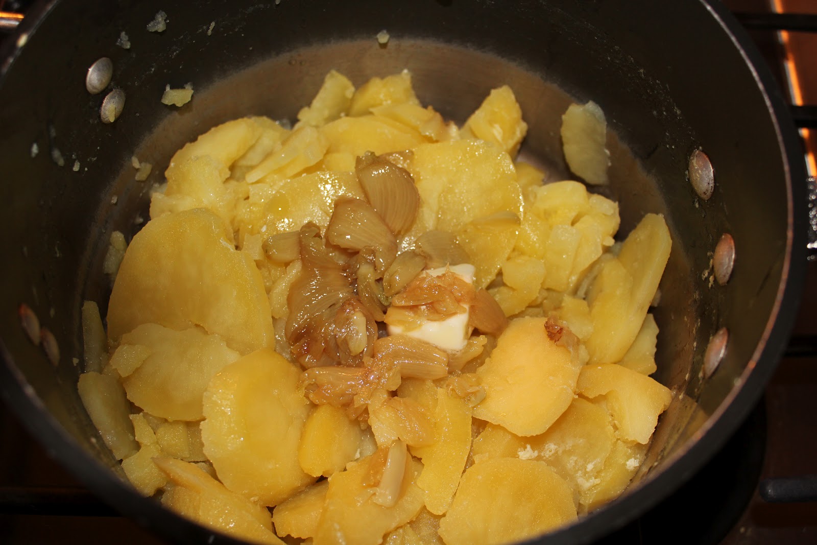 I will level the temperature off at 325. I've inserted a meat probe to be able to monitor the internal temperature without opening the grill. Meanwhile Peggy and I are able to sit and enjoy some time in the sun room. Once the cooking process starts moving along I will start preparing sides. Peggy has peeled some Yukon Gold potatoes, and I am fixing to make the best Garlic Mashed Potato recipe I've ever had. I will drain the potatoes and add a small amount of butter for flavor. I use a small knife and pop each clove out of the pod of garlic adding all of them to the potatoes, followed by a generous drizzle of the olive oil that the garlic roasted in. This will give them a smooth, silky texture that is unmatched. I use condensed milk to get the final consistency I like.
